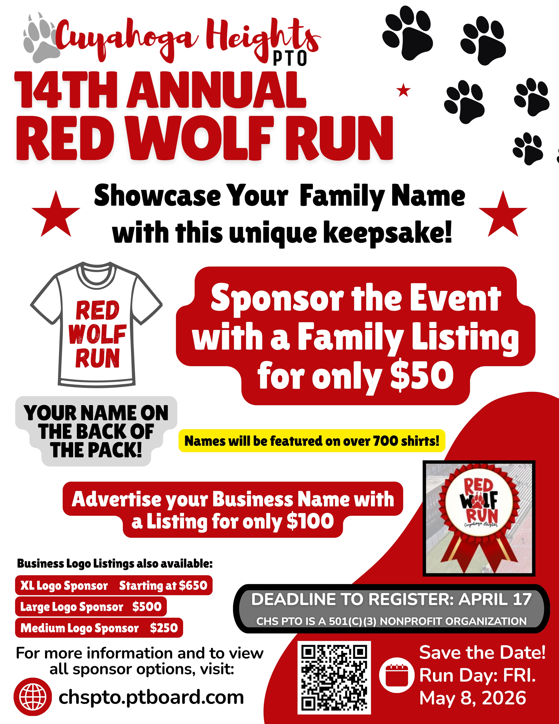 The Red Wolf Run is the PTO’s largest fundraiser of the year, helping provide programs, activities, and resources that benefit students across Cuyahoga Heights Schools. Sponsoring the event is a great way to support our students while showcasing your business or family name to the school community. |