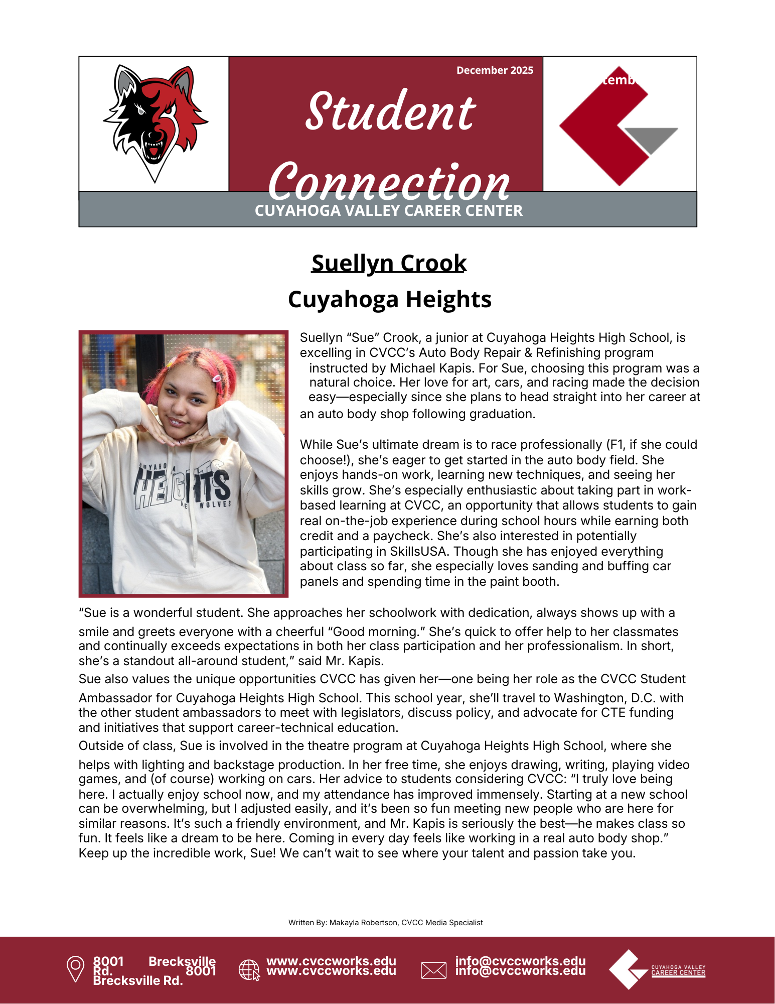 On Tuesday, December 9, our sophomore class had the exciting opportunity to visit the Cuyahoga Valley Career Center (CVCC), where they toured all 28 career and technical programs offered. CVCC provides Cuyahoga Heights students with hands-on training and real-world experience during their junior and senior years. Students who complete a program are well-prepared for their next steps—whether that’s enrolling in college, entering an apprenticeship, or joining the workforce immediately after graduation. Along the way, they can earn valuable industry credentials and even college credit. It was an inspiring day that helped students begin envisioning their future pathways! |