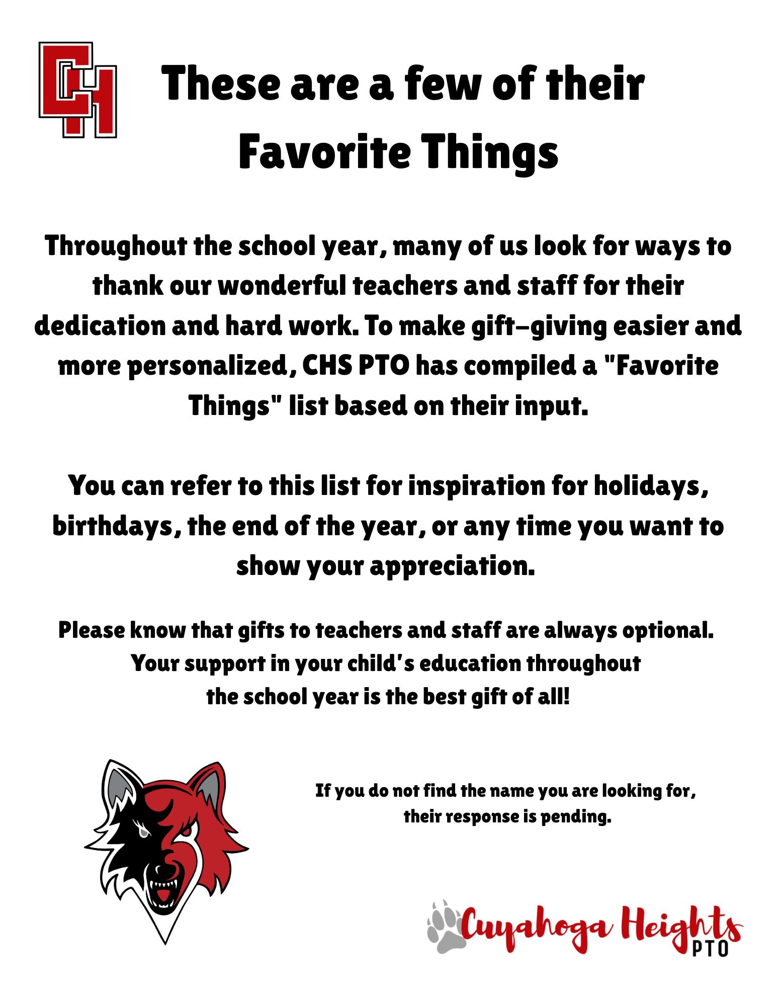 Throughout the school year, many of us look for thoughtful ways to show appreciation for our teachers and staff and all they do for our students. To make gift-giving a little easier—and more personal—the CHS PTO has gathered a “Favorite Things” list based on their own suggestions.
