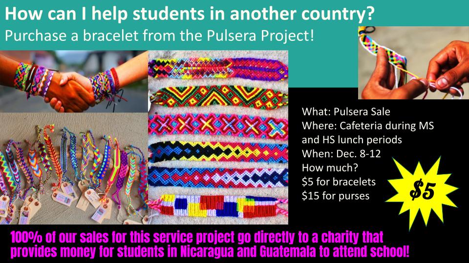 Spanish Club will be hosting a “pulsera” sale to raise funds for Central American artisans. The Pulsera Project is a nonprofit organization that works with over 200 artisans in Guatemala and Nicaragua to sell beautiful, handwoven bracelets (“pulseras” in Spanish) as well as small “bolsitas” (purses).