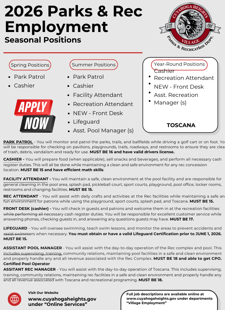 It's that time of year again! Are you in need of a job this summer? Applications are now open for the 2026 season for the Parks & Recreation department at the Village of Cuyahoga Heights. We work around school schedules, sports, for all our seasonal staff. We can offer different positions for the summer and the school year at Toscana. All our open positions are available to see on our website under Village Employment, for seasonal and part-time roles. https://www.cuyahogaheights.gov/employment/