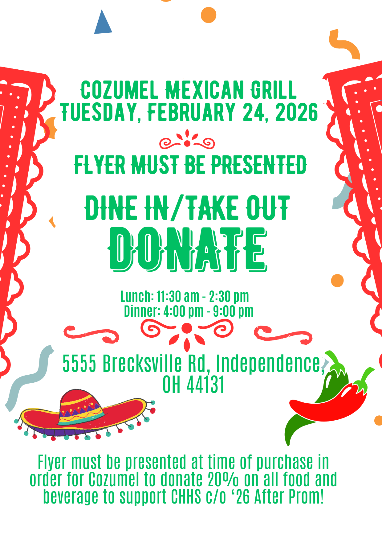 Support the Cuyahoga Heights High School Class of 2026 After Prom by dining at Cozumel Mexican Grill on Tuesday, February 24, 2026. Community members are invited to participate during the following times: |