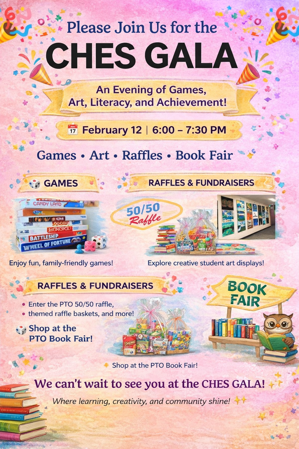 Guests can enjoy a variety of family-friendly games, explore student art displays, and take part in several raffles and fundraisers, including the PTO 50/50 raffle, themed raffle baskets, and a game board raffle.