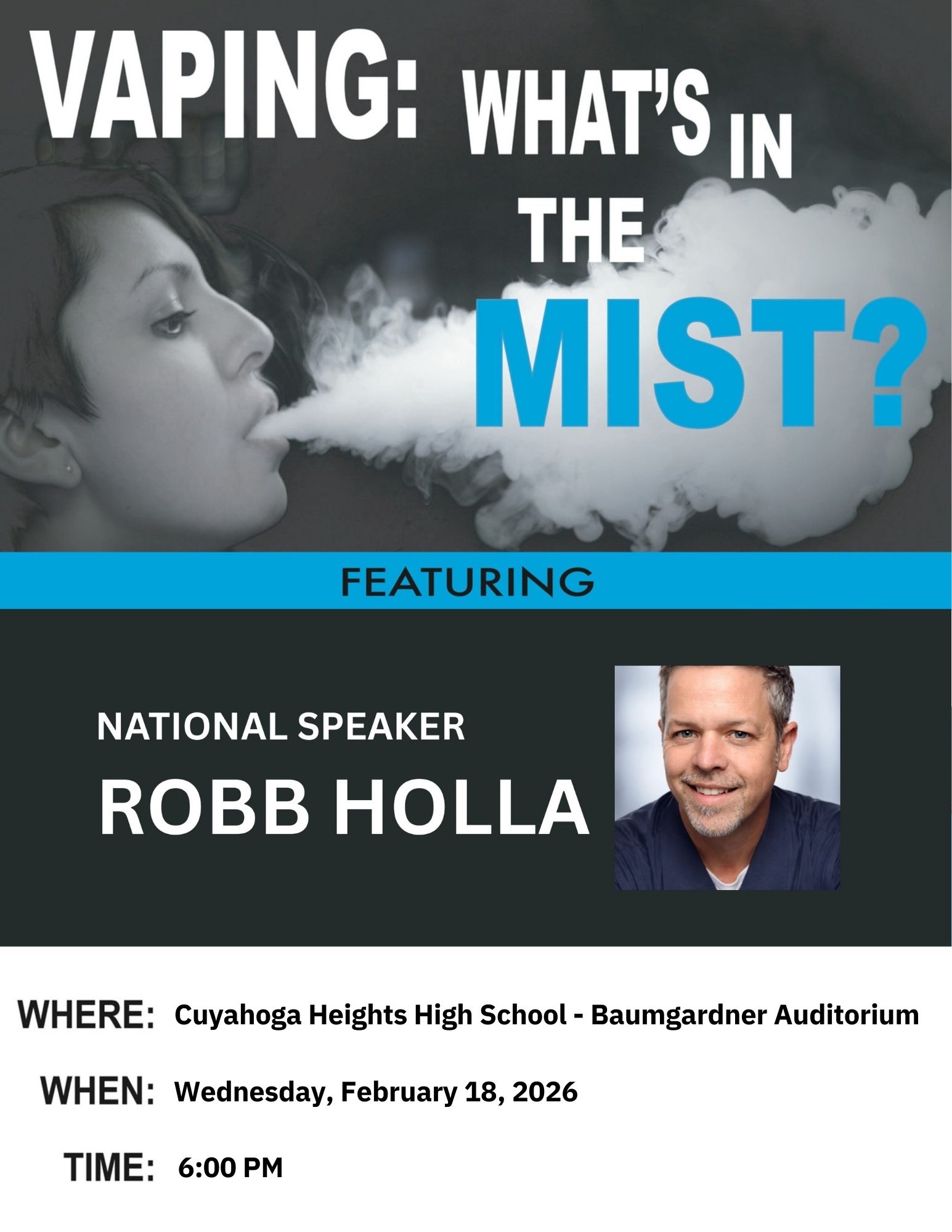 Cuyahoga Heights Local Schools will host a Vape Awareness parent presentation titled Vaping: What’s in the Mist featuring national speaker Robb Holla on February 18, 2026, at 6:00 PM in the Baumgardner Auditorium at Cuyahoga Heights High School.