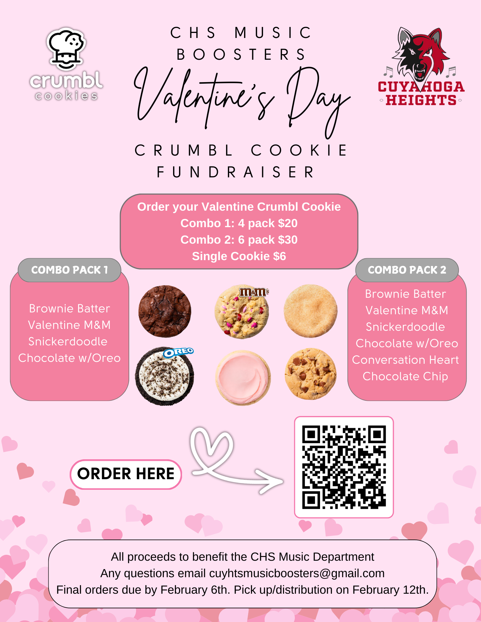 The CHS Music Boosters are excited to host a Valentine’s Day Crumbl Cookie-Gram Fundraiser, and we’d love your support.This delicious fundraiser is the perfect way to treat someone special while helping our talented music students.