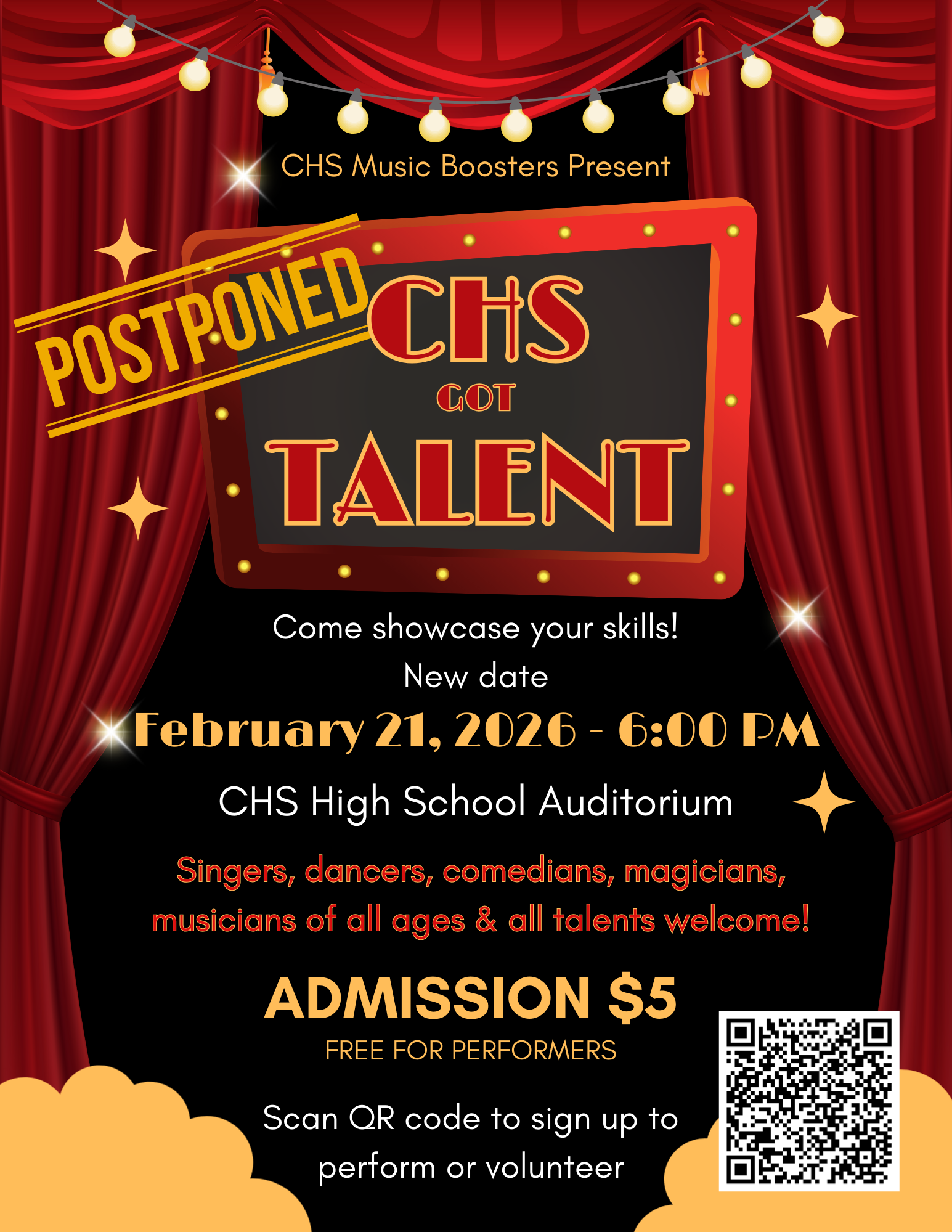 If you already signed up to perform or volunteer, your spot will carry over to the new date. Additional performers and volunteers are still welcome, and sign-ups remain open via the QR code on the event flyer or by clicking HERE to register your act. Thank you for your understanding and continued support. We can’t wait to see you in February for a fantastic night of talent at CHS!
