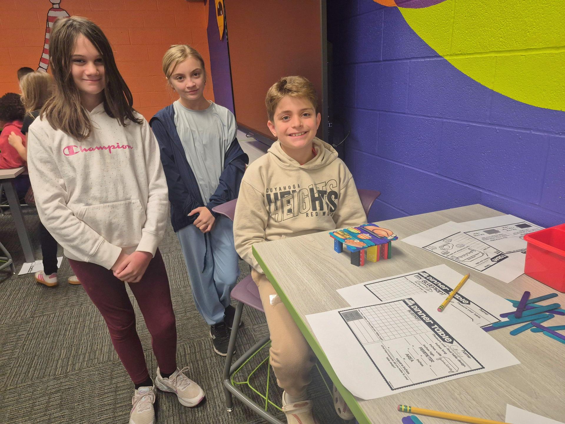 Working in groups, students used dominoes and craft sticks to build their own miniature tables. The challenge? Their table had to hold all of their cut-out Thanksgiving dishes without the dishes touching each other or hanging off the edge. Once their designs were complete, each group measured their tables to calculate perimeter and area.